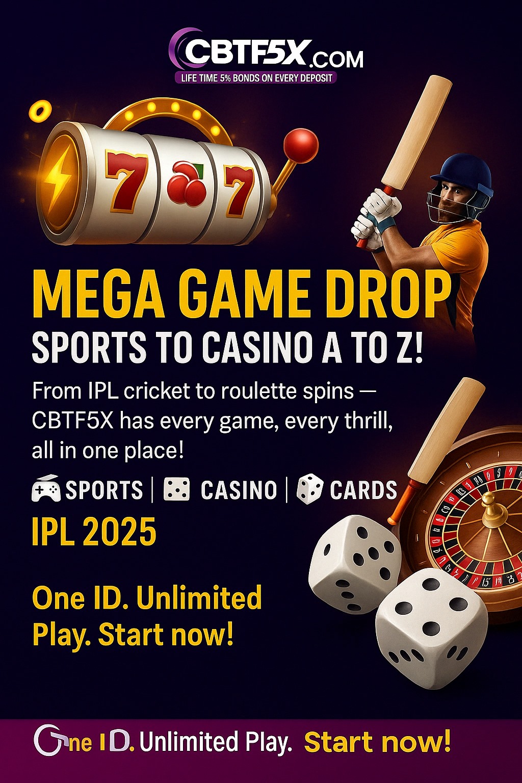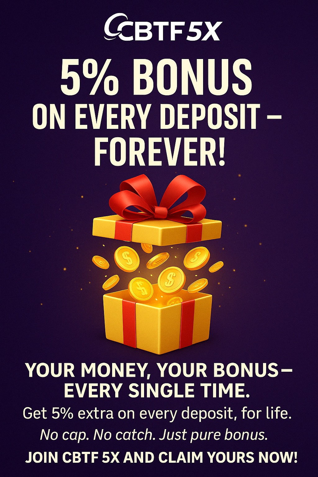 Unlock guaranteed value with CBTF5X! Enjoy a lifetime 5% bonus on every deposit — no limits, no expiry. More bonus means more power to play and win. Join today and make every deposit count!